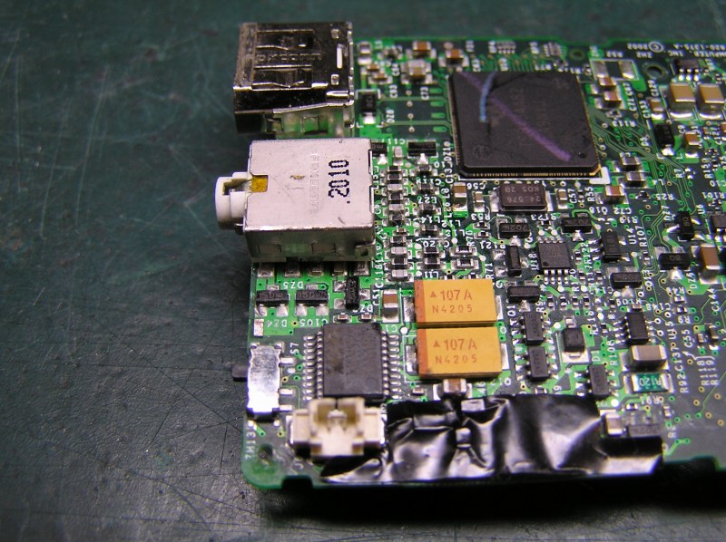 早速ハンダ付けしなおします。いまさら気がついたことですが、白いヘッドホンジャックの向こう側、FireWireコネクタとの間にも同様に5本の足があり、FireWireコネクタを実装する前に作業をしておけば広々楽々作業ができたのに、現状やや狭くてやりにくいです。 |