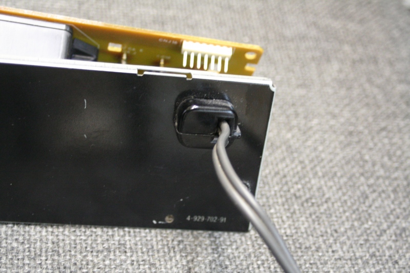 まず、あまりにも貧弱な電源コードが目に付きます。本機は決して高級機では有りませんが、セットモノの安物でもありません。単品売りされているもののようです。いくらCDプレーヤーが消費電力が僅かだからといって、気になるところです。この電源コードを交換すべく、背面パネルを外します。この世代のソニー製品には多用されているコードブッシュなので、同様に作業できる機種は多数あるかと思います。 |