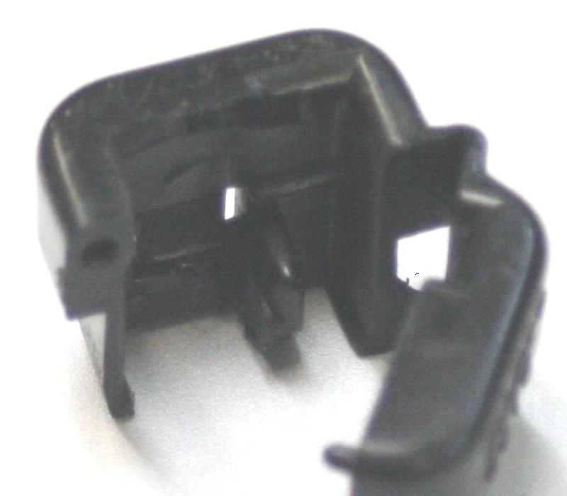 コードブッシュを外したならば、糸鋸盤で余計な部分を切除し、カッターナイフで仕上げます。写真はかなり拡大していますが、2センチ程度の小さな部品ですので、実践される方はくれぐれもお怪我の無いように。なお、削りすぎるとスカスカになってしまってストッパとしての役割が失われますので、削り足らない程度で仕上げます。 |
