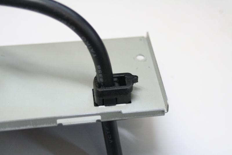 用意しておいた太目の電源コードを通し、パネルにはめ込みます。写真はパネル裏の様子です。きつめに加工しておいたので、この状態でコードは既にぴくともしませんが、内側に結束バンドを念のため入れておきます。この後の画像でご覧ください。 |