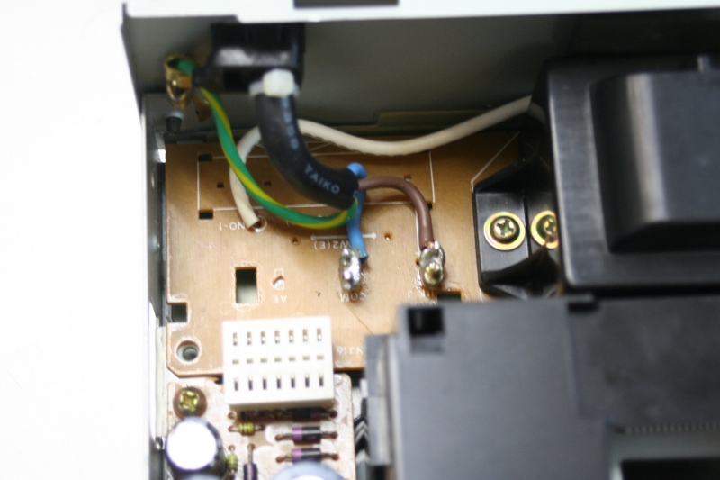 パネルを戻したならば、元通りに配線します。アース線も付いているので平ラグを付けてシャーシにしっかり挟み込みます。 これで電源コード交換はおしまいです。この程度なら難易度も高くはないので、工程ごとに解説を多めに書いてみました。もちろんこれだけで終わるはずがありません。作業はさらに続きます。 (すべての画像はクリックで拡大します) |