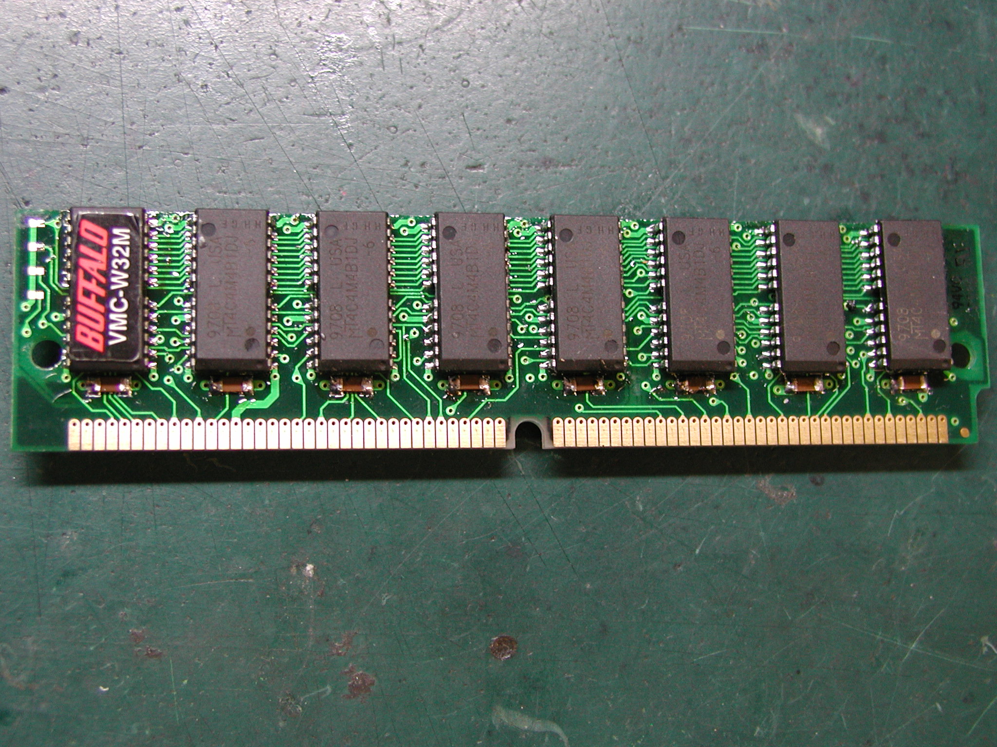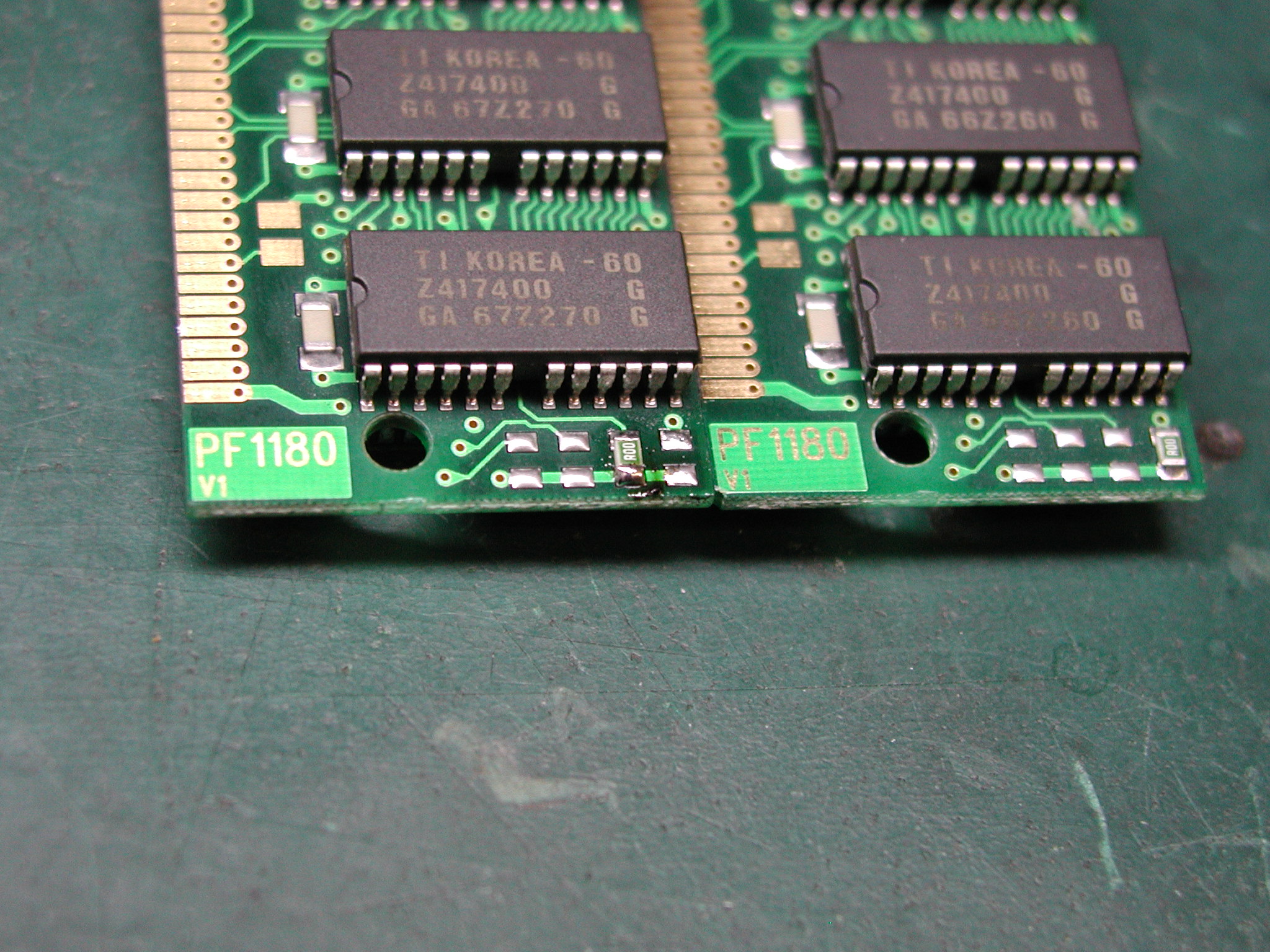 応用として、 ・Sunの5VDIMM 64MBを2枚利用して128MB化に成功してます。 ・Macの5VDIMM 8MBに8MB SIMMからチップを頂戴して16MBに成功しております。 そのほか、裏面にプリントパターンがあるものでしたら成功の可能性があります。ただし、ジャンパ抵抗の移動などが必要な場合があるので注意が必要です。入手困難な専用メモリなどに有効な手法といえるでしょう。 |