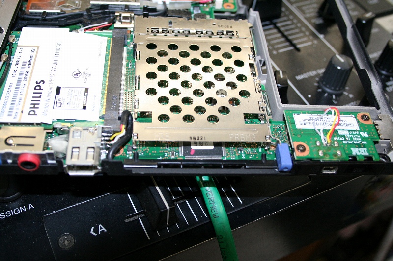 さきほどコンデンサ跡地からケーブルを取り付けておきましたが、その先にコンデンサを取り付けます。 本来あまりケーブル長を引っ張るには好ましくないですが、なにしろ狭いので仕方ありません。写真のようにハンダ付けしてゴムチューブで絶縁します。取り付けスペースの都合上、径の小さい別の同容量のパーツに交換してあります。これをminiPCIの脇の空間に納めます。 |