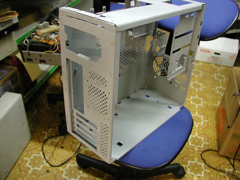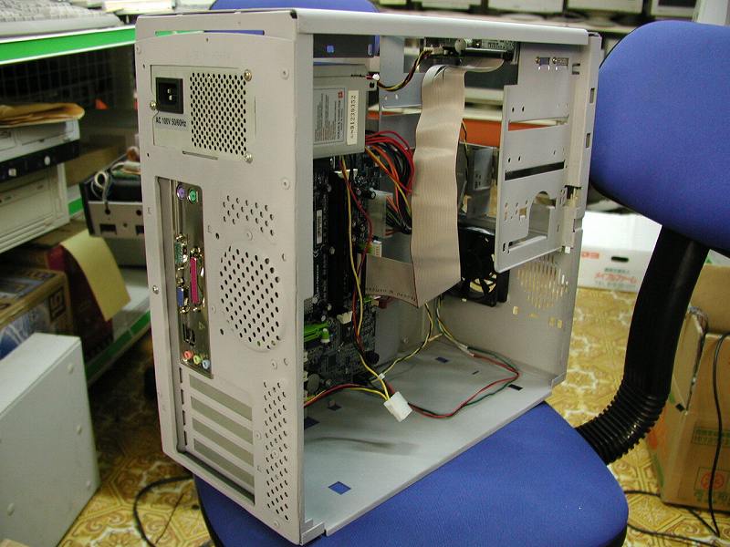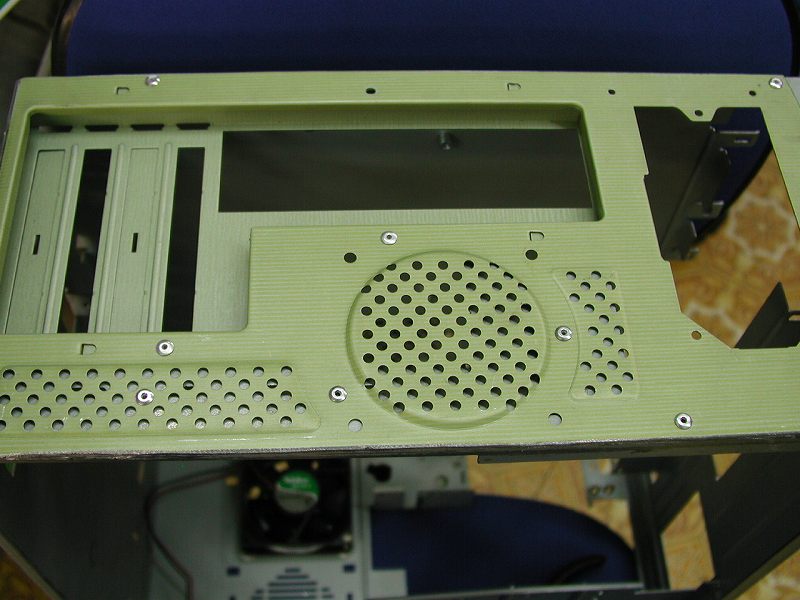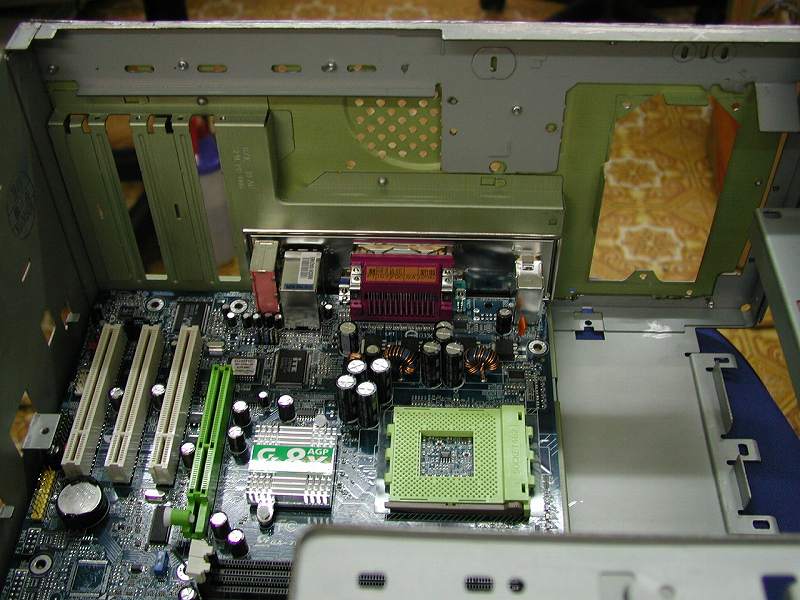 削るべきところを削り終え、取り付け位置も確定したならば、1箇所だけ固定してみます。十分な剛性を確保できそうな場所に穴を開けリベットを打ちます。これで位置が完全に固定されますので、実際に載せるマザーを実際に載せてみます。写真はケース内部から撮影しました。元々のAptivaケースを最大限生かしている様子が確認できると思います。チップセット上の「AGP8X」のエンブレムがまぶしいです。マザーはGIGABYTE社製GA-7VM400M。結構な性能が期待できます。 (右写真・画像をクリックで拡大します)→ |