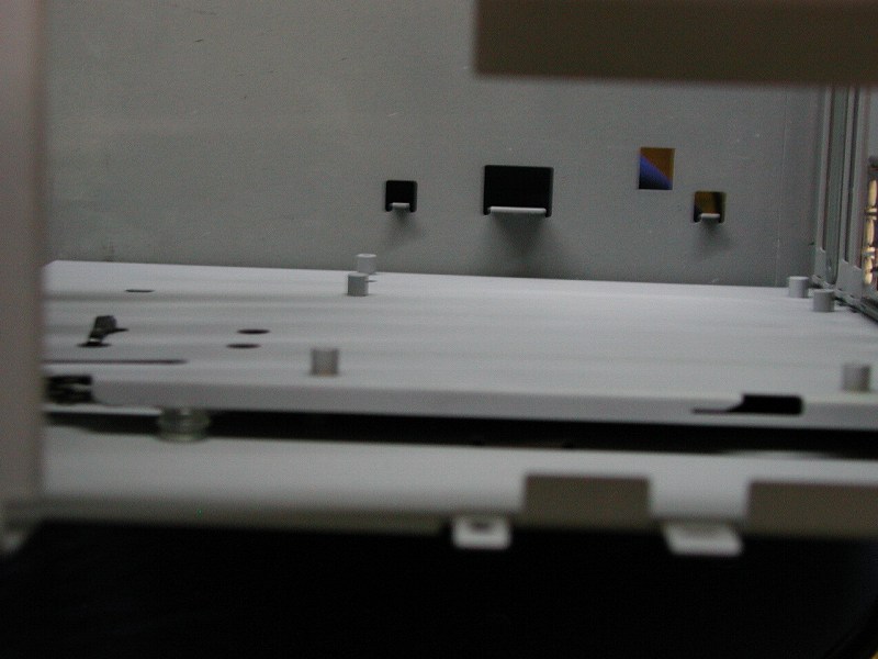 | すでに塗装は済んでいますので現段階からの削りだしは一切出来ません。ここではマザーポードの水平性とケースとの並行性をクッションゴムをはさみ完全に調整しました。これによりバックパネルとマザーボードを完全に垂直になります。これは、非常に重要で、もし、垂直でなければPCIカード類が斜めにマザーに刺さることになり、動作不安定の原因になります。背面パネルとの垂直性はこのようにケースとして重要な要素です。右写真ではケースとベースボードの平行性が確認できると思います。なお、下側とベース中央にも同じクッションが入っています (右写真・画像をクリックで拡大します→) |