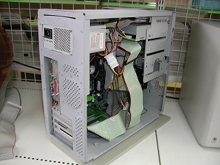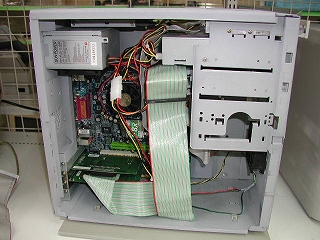 内部はこんな感じです。 まっすぐ上に立ち上がってるのはMOドライブのためのSCSIケーブルです。 メーカー製パソコン並とはいきませんが、整然とまとまっています。 (右写真・画像をクリックで拡大します)→ |