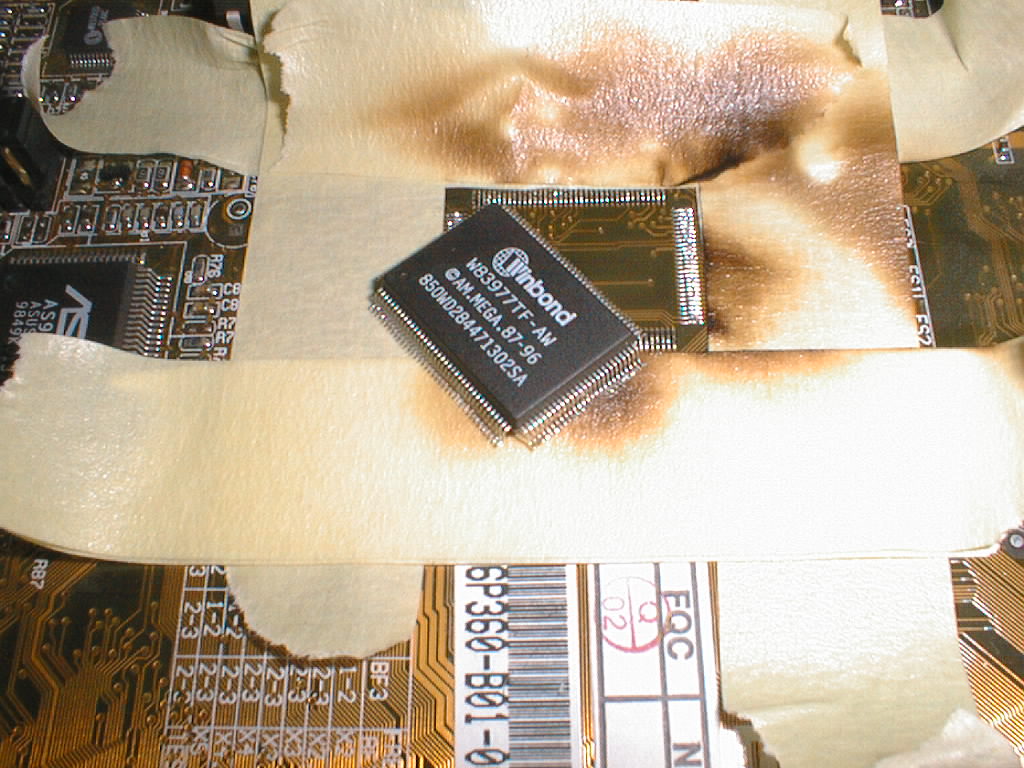 熱風ではずすのでチップコンデンサなどは簡単に吹き飛んでしまいます。また、カードエッジなどのスロット部に半田が付着するとアウトです。そこでターゲットの周りだけを残して他の部分をテープでマスクします。通常の部分は1重でかまいませんが、樹脂製の部品(コネクタなど)は2重3重にはった方がいいです。今回の事例は周りに部品が少ないのでこの程度で十分です。ここまでは簡単ですね |